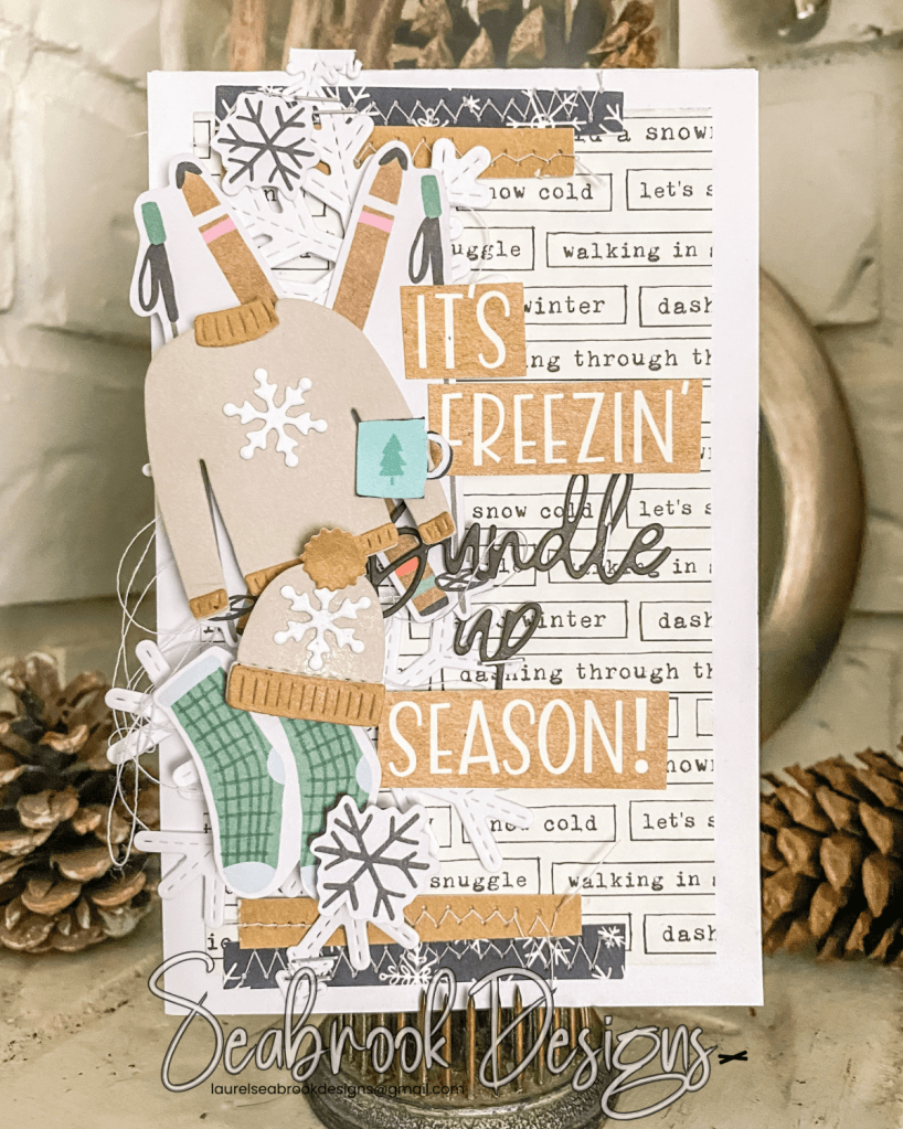 I used some older papers and ephemera from Simple Stories. The toque and sweater are from a Concord & 9th die. I also added one of my most used winter dies – the snowflake border from Poppy Stamps (I think)