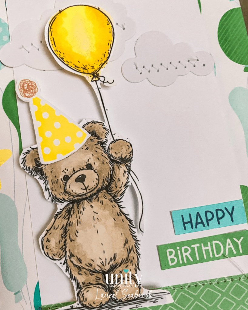 The sticker hat was the perfect size, so I adhered it to scrap paper and cut it out. I do this often because I prefer ephemera as I can play around until I like the look and I can add foam squares to them so they pop up, which is what I did here and with the bear.