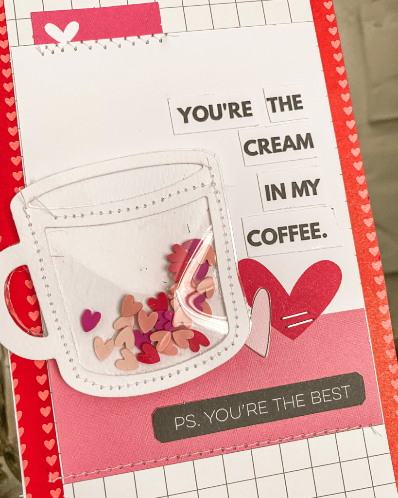 For my card I used a few old things. First up, those heart confetti in the shake are from CTMH, the journal card and elements are from an old Elle’s Studio kit, Feels good to stash bust doesn’t it? To make the shaker I used the die from Lawn Fawn Build a Drink Mug Add On Dies.