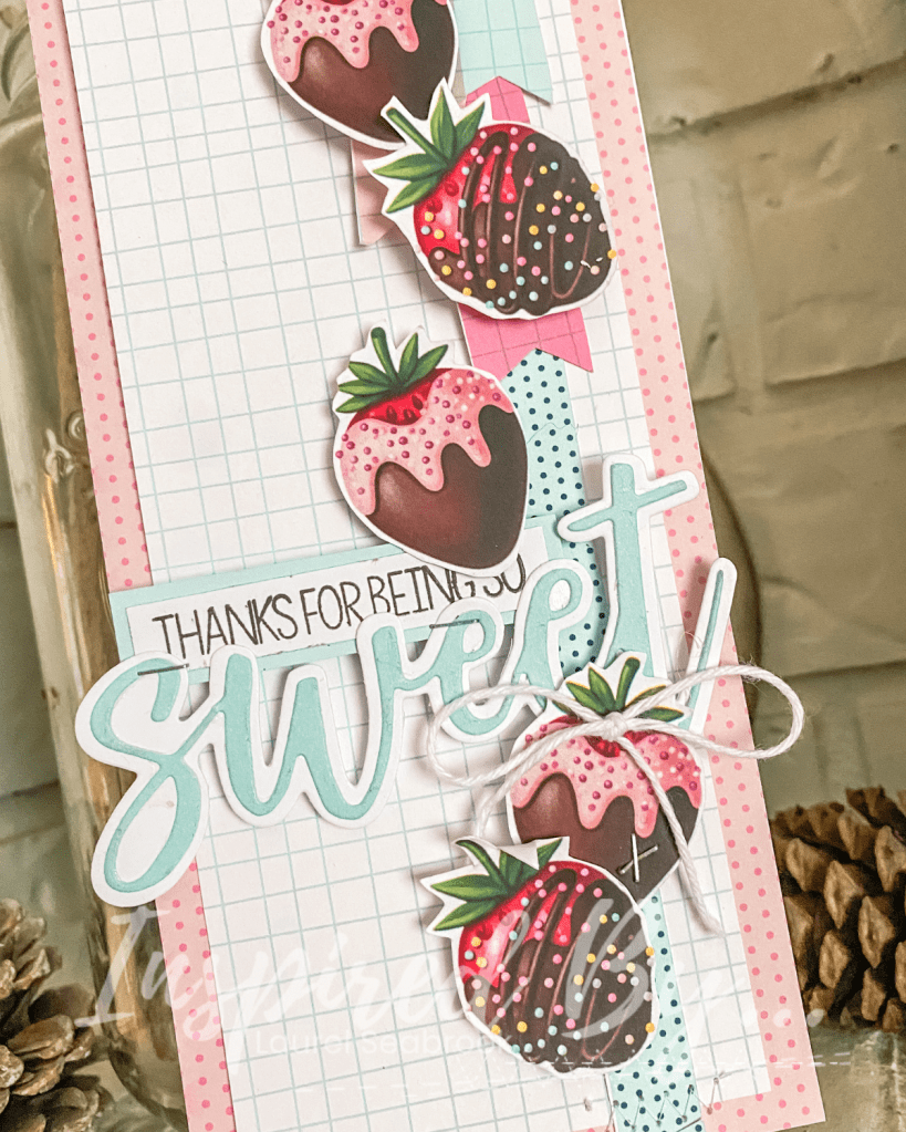 I just felt like making a tall skinny card as it had been awhile and I dug into some hoarded old CTMH paper – love this set and now I don’t have much left. The sentiment is from The Stamps of Life. Of course I mounted the strawberries and sentiment on foam squares.