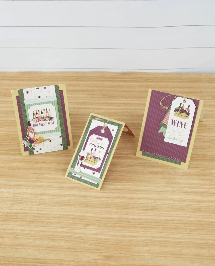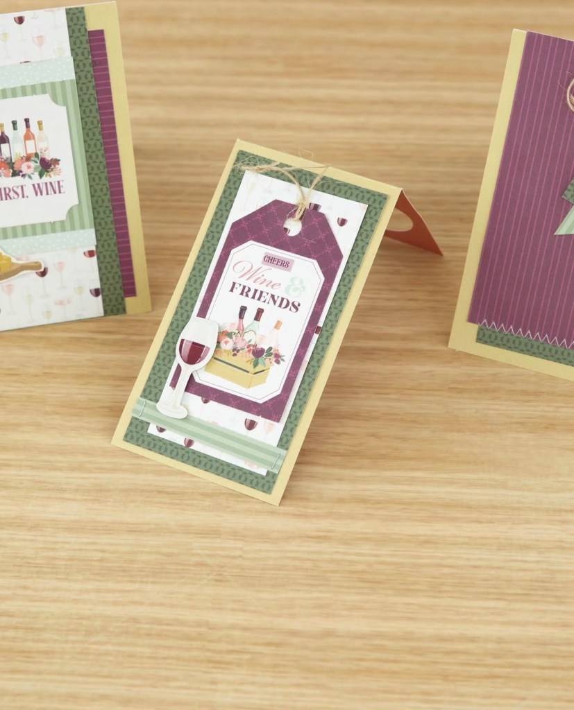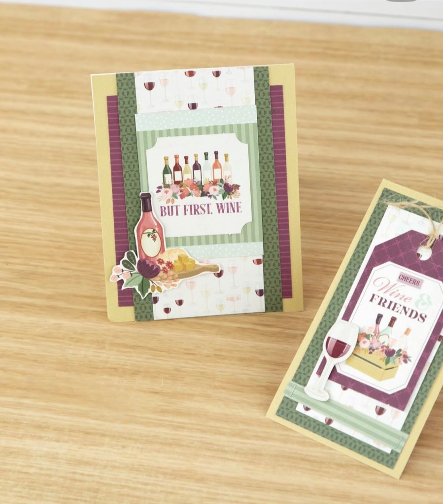 I am so excited to have my first projects up on the Echo Park page today. For this one I used the new Wine collection to create a couple of cards and a wine bottle tag. Would be perfect for a girls night don’t you think?