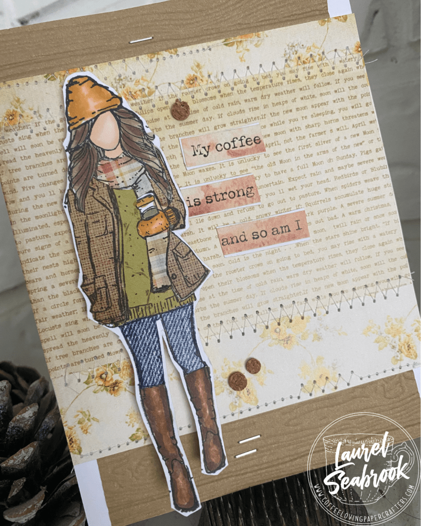I had fun paper piecing her, something I used to do all the time. I thought the denim paper was perfect for her pants, don’t you think? I fussy cut her out and mounted on foam squares for some dimension