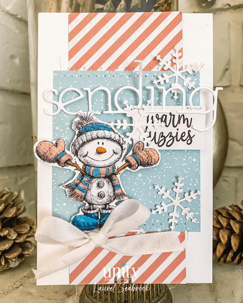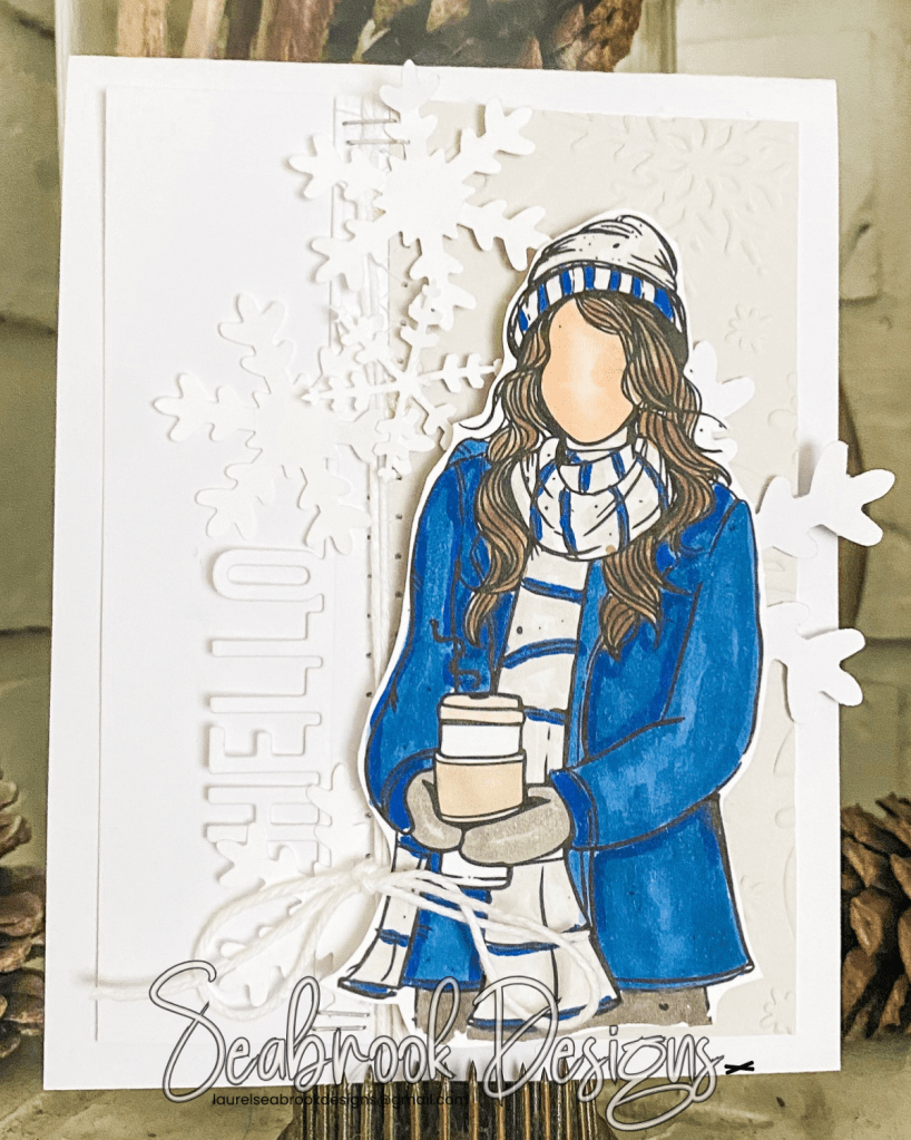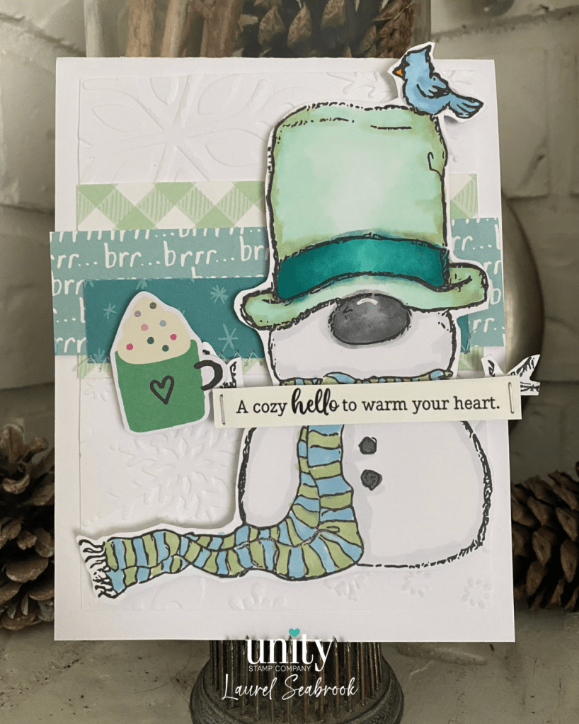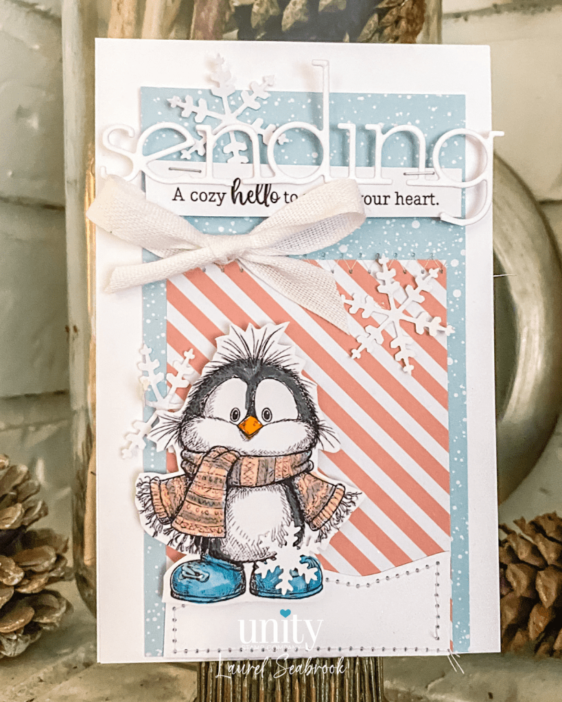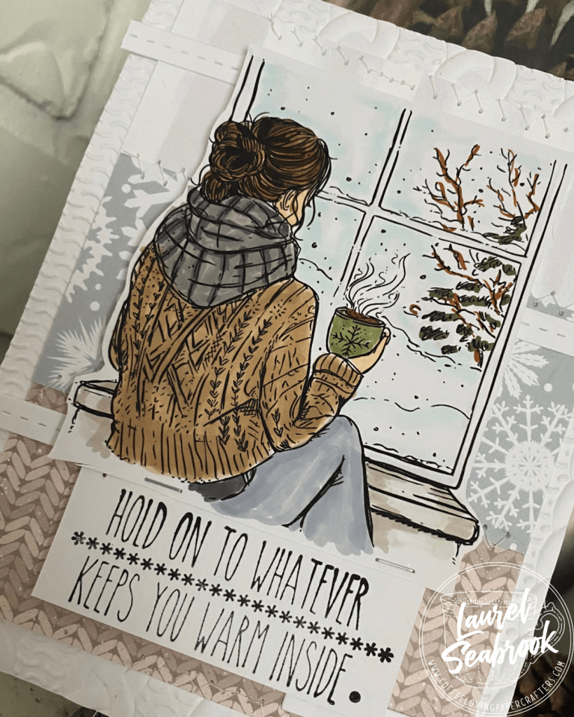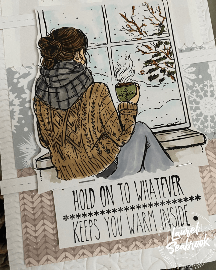 Playing along with the Inspired By challenge and the theme challenge over at Coffee Lovers Papercrafters which is Sweater. I used the Perfect Girl Angiegirl paired with Talking Out Loud (on sale so grab it, such a fun and versatile stamp set) and the It’s a Mug Hug. I paper pieced her sweater with a scrap piece. I used to paper piece all of the time and haven’t done it for a while – you just may see more…. 😉 The Snowflake paper is also from Unity it is the Snowy Winter Greetings.