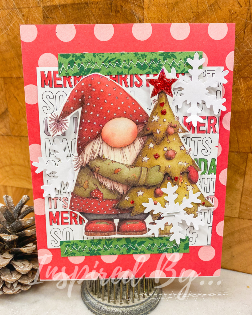 The new Inspired By Challenge is up and I was inspired by the gnome which of course is quite evident from my card LOL. This cute gnome is part of a fun collection, which you can see here. I paired it with some older Elle’s Studio papers and added a bit of glitter glue to the star and some ornaments