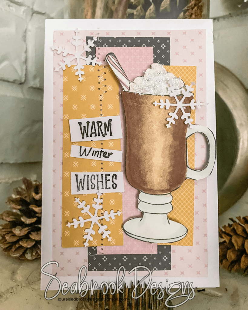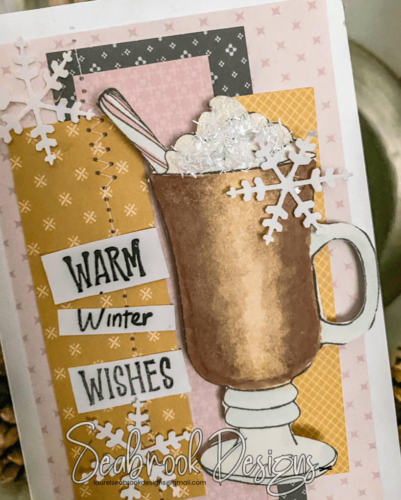 I used my Lawn Fawn Die along with some Stampin Up papers to create my card. I added some glitter to the ‘whip cream’ and used glitter paper to punch out some snowflakes.