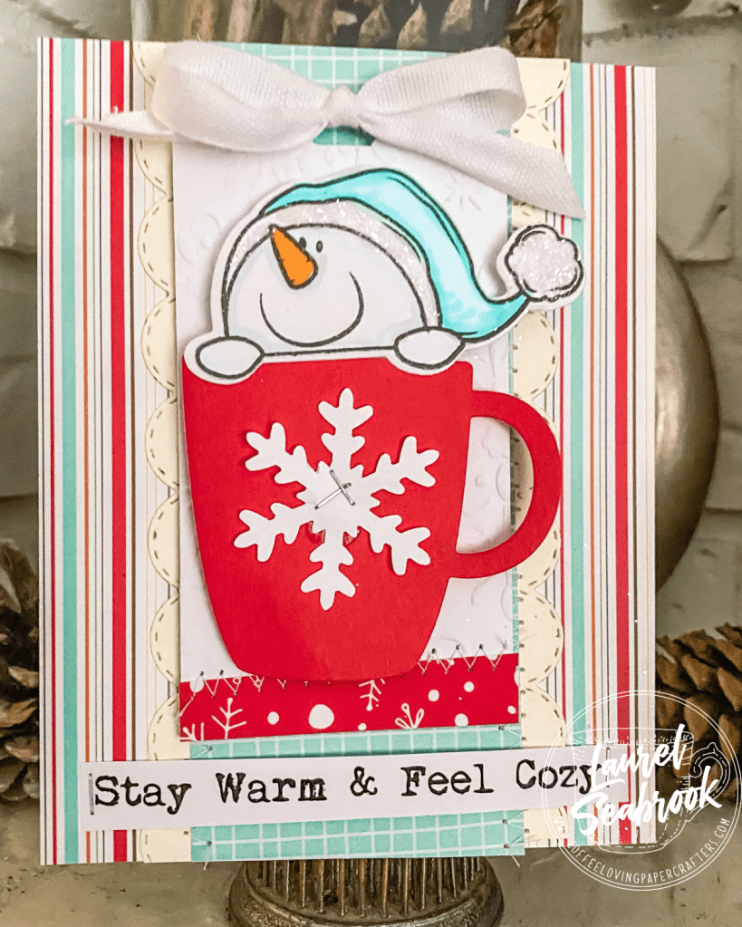 It’s National Cocoa Day so of course I had to create a card for the occasion. Actually I am going to see how many I can create today! This is the first of 2 so far. I used the Farmhouse collection from Carta Bella, which isn’t a Christmas/Winter collection but I thought the colors worked well for it. The mug die is from MFT, the snowman stamp is from Pinkfresh Studio and the sentiment is from Unity.