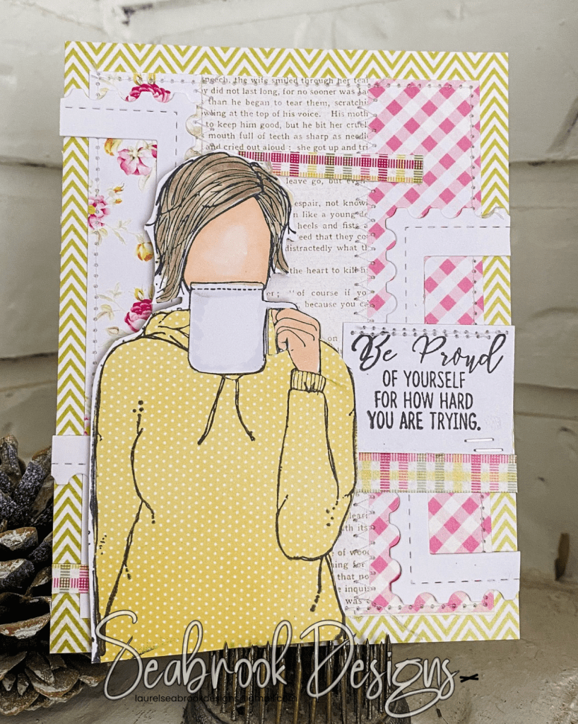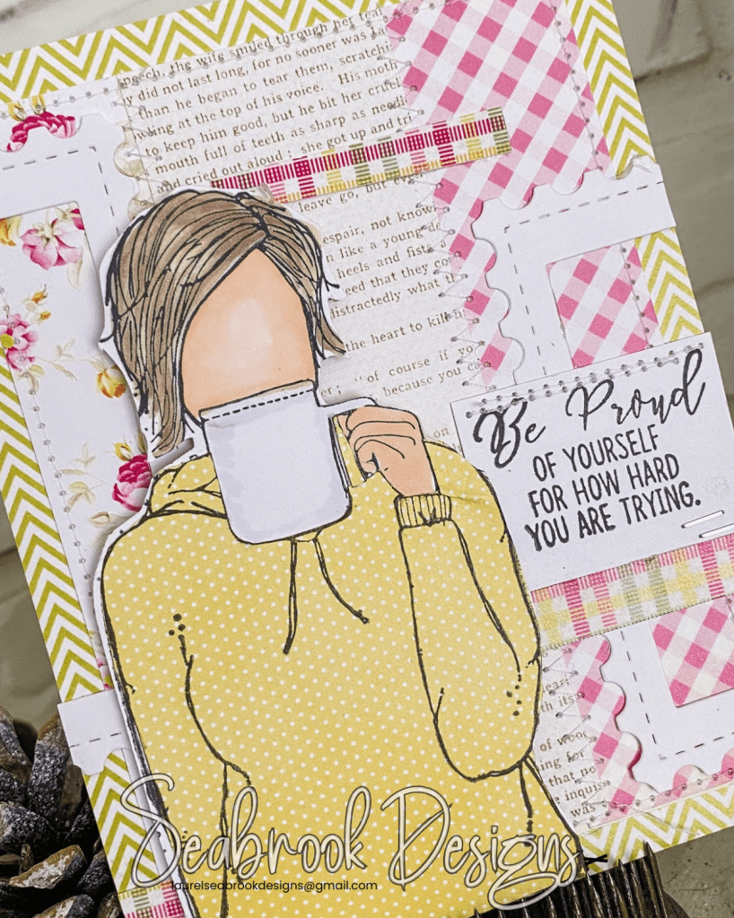 I have used a couple of AngieGirls from Unity Bailey Girl and Jane Girl along with the And Then it was Spring paper pack. I paper pieced the hoodie. I wore a yellow hoodie the other day and got many compliments so I was in a yellow hoodie mood! LOL