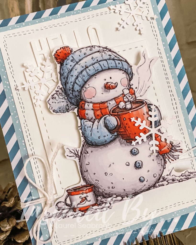 The new Inspired By Challenge is up and I was inspired by the colors and winter theme. I used a new image from Angie Blom Designs along with some papers from Simple Stories. I had the die cut frame laying on my desk for a previous project so I incorporated it and added a bit of glitter to it. I was going for the look of walking around a winter ski village (here it would be Whistler, which is on my bucket list one day to spend a weekend there). To add even more detail to the card I embossed the white cardstock and then finished off the card with some snowflakes.